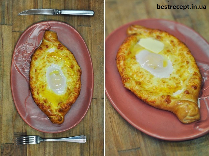 - Готове хачапурі дістаньте з печі, покладіть зверху шматочок вершкового масла, і їжте негайно, відламуючи тісто і вмочуючи його в ніжну і соковиту начинку.