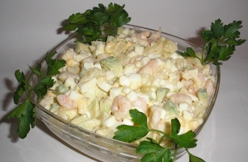- Варену картоплю і зварене круто яйце нарізати скибочками, додати зелений горошок і підготовлені креветки (частину їх залишити для прикраси).