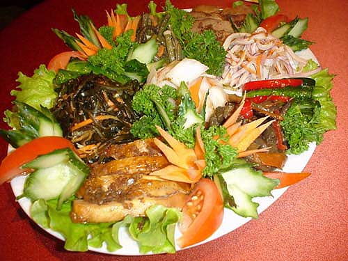2. Прикрасити тарілку або блюдо листям зеленого салату, викласти на них підготовлену рибу, залити майонезом, навколо розкласти овочевий салат.