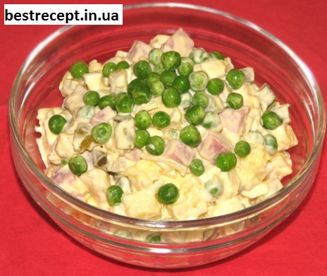 2. Підготовлені продукти з’єднують, додають варений роз-сипчастий рис, заправляють майонезом, сіллю, чорним меленим перцем. Готовий салат прикрашають шинкою, помідорами, листям салату і посипають дрібно нарізаною зеленню.