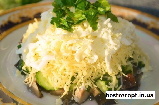 - Викласти шарами знизу вгору: гриби, кура, огірки, сир, яйця, зелень.