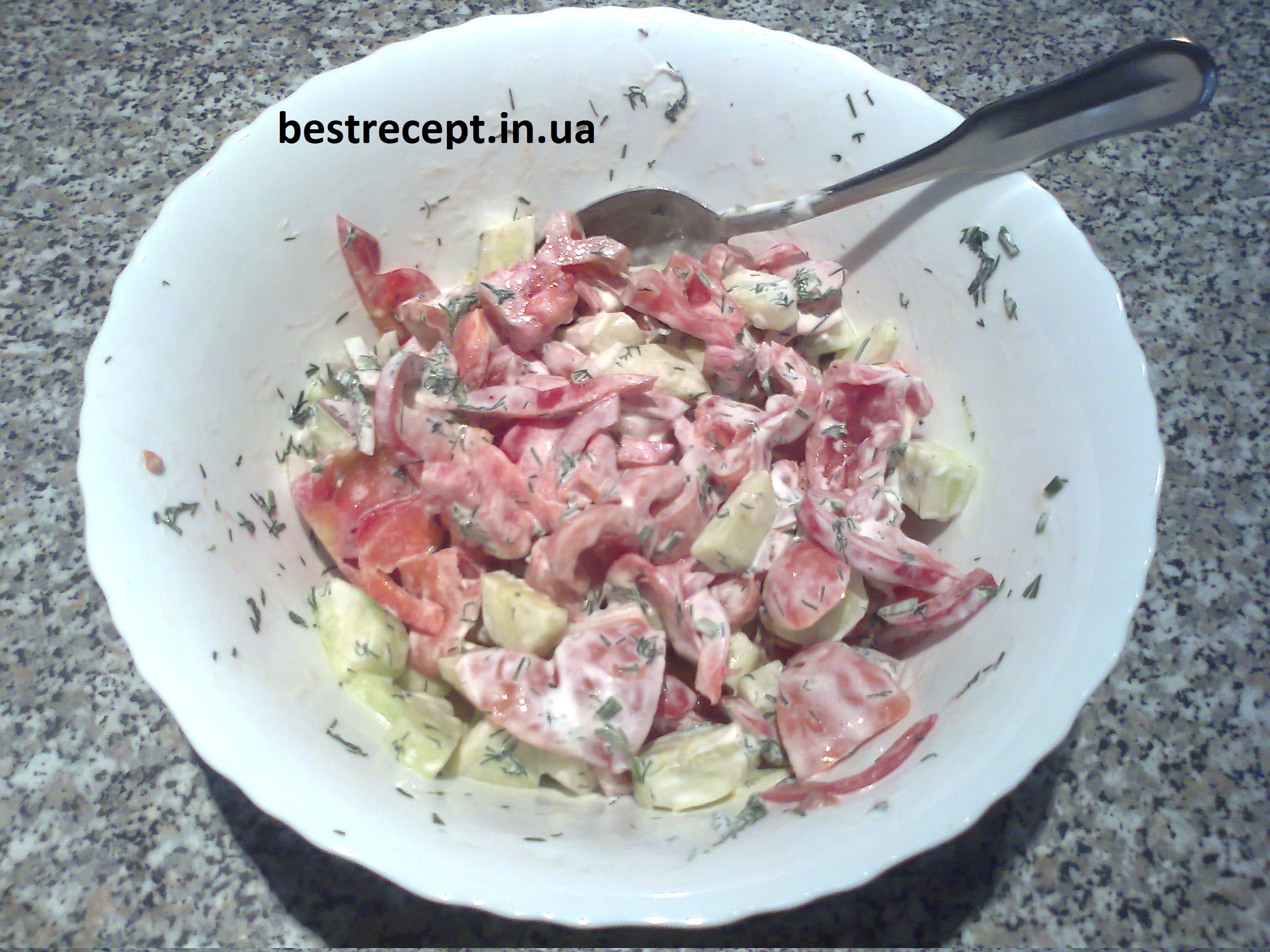 - Солодкий перець вимити, розрізати уздовж, видалити зерна, нарізати тонкою соломкою, змішати з огірками, збризкати оцтом, посолити, приправити, трохи перемішати, залити сметаною, прикрасити помідорами і зеленню петрушки.