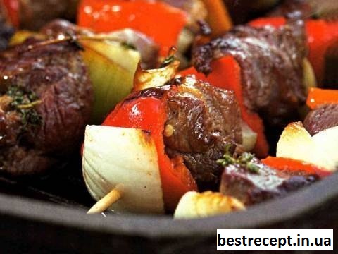 4. Цибулю чистимо, а з перців видаляємо серцевину і нарізуємо їх великими шматками. Беремо дерев’яні шпажки і нанизуємо на них упереміж м’ясо, цибулю і перець. Підготовлені шашлики кладемо на грати і збризкуємо маринадом.