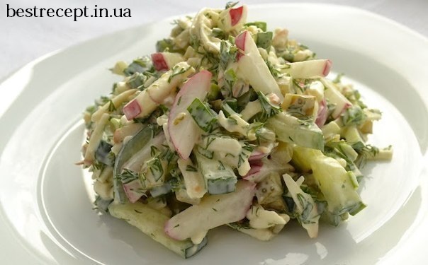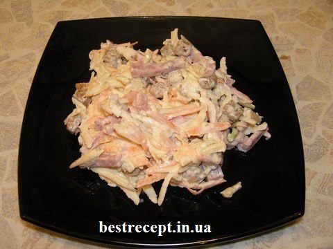 Інгредієнти: Капуста, свіжий огірок, цибулька, ковбаска (кому яка подобається), майонез, …