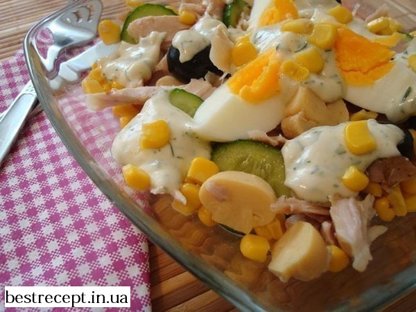 Інгредієнти: Куряче м’ясо (відварене), мариновані грибочки, огірок свіжий (можна маринований), …