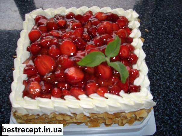 - Тісто розкачати у вигляді круглого коржа завтовшки 1—2 см, покласти у круглу форму з рифленим краєм, поверхню наколоти виделкою і випікати при температурі 180—200°С до золотавого кольору, охолодити, збити вершки (сметану), ароматизувати ваніліном.
